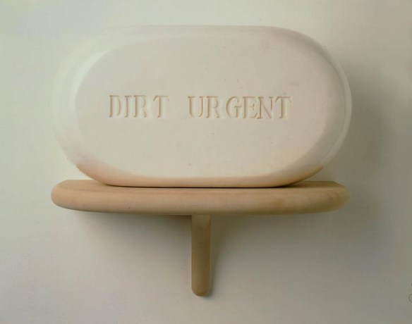Pigott goes further. In an exhibition in a show flat in London sometime in the 1990s (my memory is hazy on the details, but clear on the work), he broke his own morning ablutions down into stages (it’s a long time ago, but about nineteen stages, I think) and installed a series of soap dishes around the bath, each bar of soap imprinted with the name of the body part it would be used for. In the absence of a good picture – WordPress is good but it won’t (yet) let me download images from my mind’s eye – I’ll make do with Dirt Urgent. Any bar of soap in a storm. Or something.