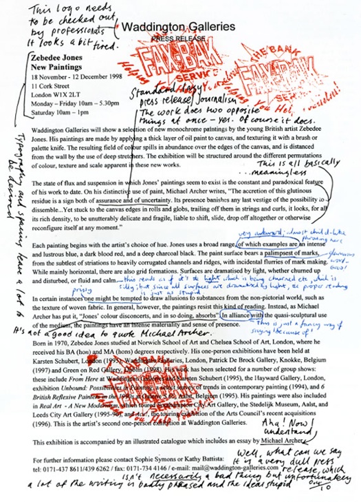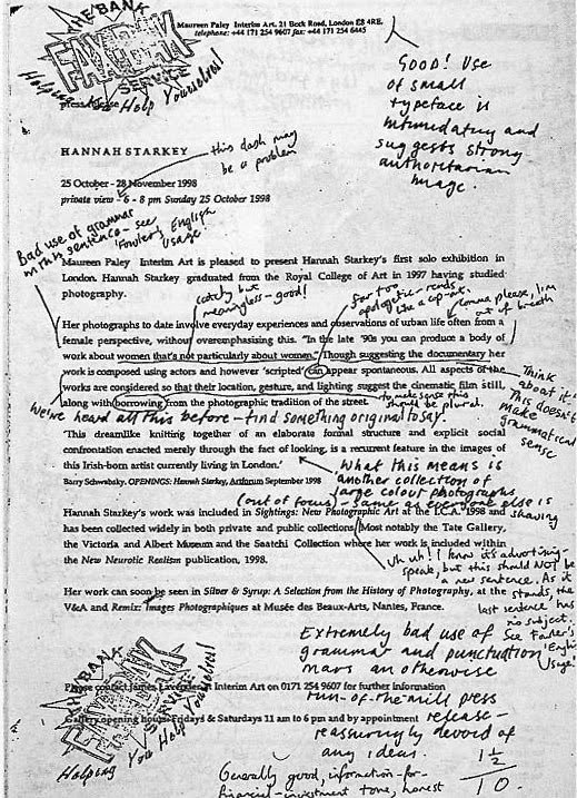 They corrected the grammar, critiqued the logos and typefaces in use, deconstructed the text to highlight the many examples of pretentiousness, meaningless assertions and general misuse of the English language on display, gave marks out of ten and faxed the press releases back to the galleries from which they had come.