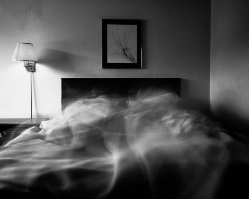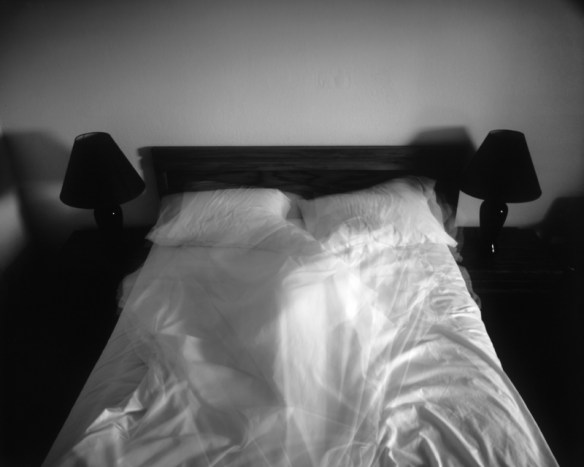 The beds in Martin Newth’s 8 Hours series are occupied though the all-night exposure means that the figures are a ghostly presence, visible only in the form of the contrast between the blurriness of the bedding and the detailed sharpness of the surroundings. Each picture, taken in American motels during the artist’s honeymoon in 2001, was made using an 8 hour exposure on a large-format camera.