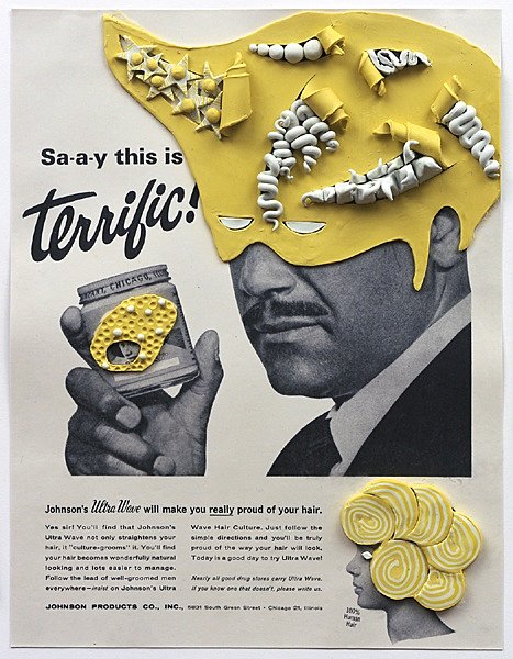 The use of yellow plasticine to provide hairstyles – of sorts – to make the models in the adverts proud of their hair is done with a lightness of touch but manages to make a serious point about the way in which black women were encouraged to see hairstyles they would struggle to reproduce – straight or loosely curled blonde hair, for instance – as aspirational.