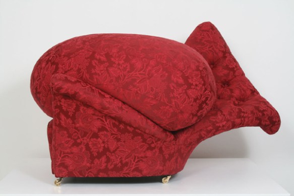 Another chair, Sincerely Yours, seems to have been caught unawares and buried under the weight of a falling missile in the form of an oversized cushion. I particularly like the contrast between the perfectly ovoid cushion which seems to have leapt into the lap of the unsuspecting chair like an over zealous puppy that doesn’t yet understand its own strength.
