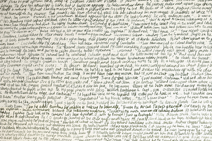 Stories can be told in many different ways, words on the page and images on a cinema screen being two of the most common. It’s when the means of story-telling becomes words on a cinema screen that things start to get confusing. I’m not sure how easy it’d be to try to follow the story of Apocalypse Now from Banner’s piece of the same name, but the narrative is all there. It’s just that it’s there as a hand-written text on a page the size and shape of a cinema screen. And only yesterday there I was claiming Sean Landers choice of line length seemed excessive!