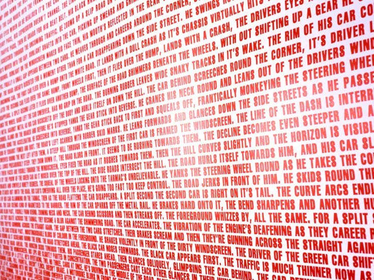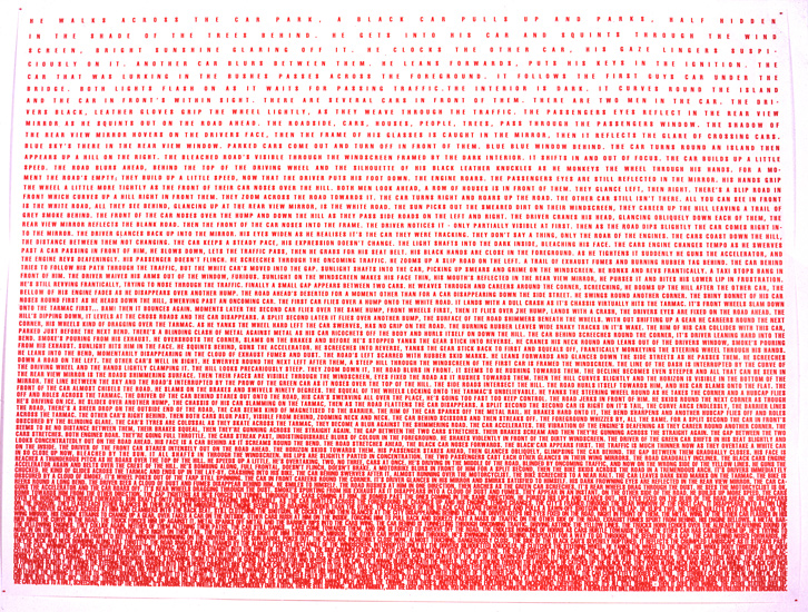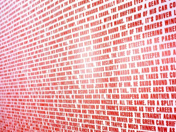 In a series of works called Car Chases, Banner addresses the lack of car chases in literature by rendering the famous cinema car chases – such as the one in Bullitt, shown here – as stencilled text. As the pressure mounts, the text gets denser with the sheet gradually moving from the white of the background to the more urgent red of the lettering. Still the form carries its own limitations. The excitement of a car chase is about speed, sound asense rising sense of anticipatiom. But we can only read so fast. Though Banner can express the excitement of the chase verbally, it’s not possible to absorb the words fast enough to match the motion depicted.