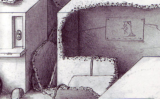 The public spaces are built on a grand scale but the houses are quite densely packed and it’s clear that all is not well in the society that inhabits them. The drawings are made on a very large scale and with extraordinary detail, making it possible to examine the minutiae of life in Nobson.