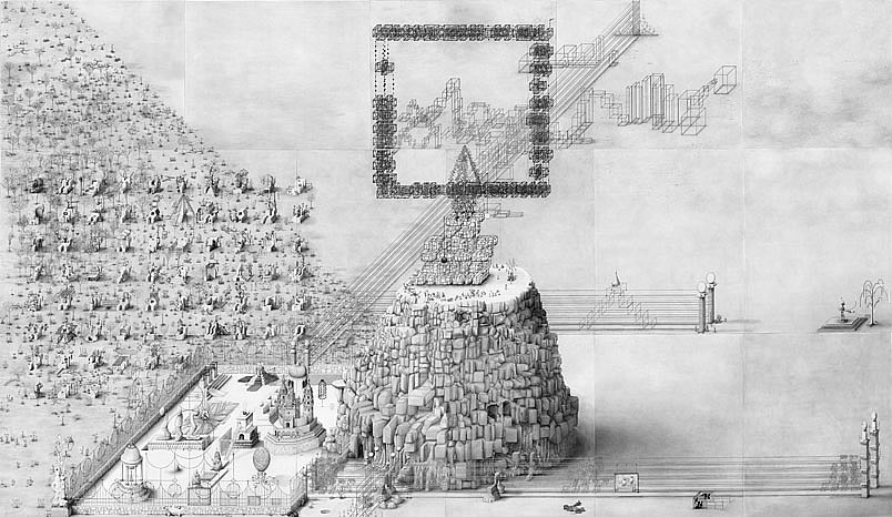 The world of Paul Noble is a strange one. His imagined city, Nobson Newtown, which he started constructing in the form of monumental drawings in the late 1990s, is a complex space. The houses are modernist boxes; the city includes open spaces and evidence of a degree of urban planning reminiscent of the utopian ideals of the garden cities and new towns of the early to mid twentieth century. Everything, surely, should be perfect?
