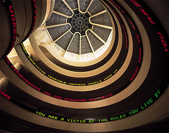 In recent years, Holzer’s work has often operated either as large scale gallery installations of moving text, an approach employed to good effect at the Guggenheim in New York in 1990 and in a long-term installation at the Guggenheim Bilbao, or as projections onto the outside of public buildings, often highlighting politcal issues in a way calculated to reach as wide an audience as possible.