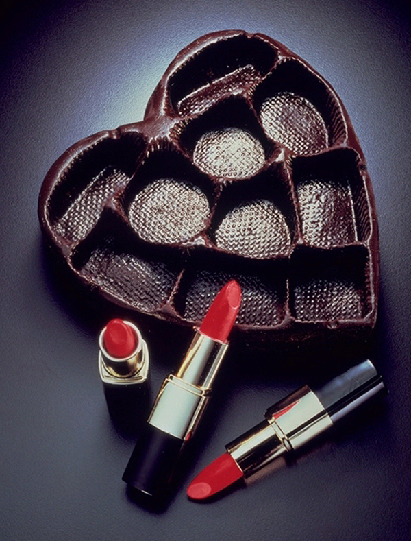 Having gnawed off chunks of the chocolate and lard, Antoni used them to make the third element of Gnaw. The chocolate was molded into the heart-shaped chocolate-box trays and the lard was mixed with pigment and beeswax to form lipsticks. Thus both substances become seductive in a way but equally both become repulsive: even chocolate loses its appeal when one knows it has been chewed by someone else.