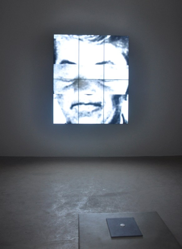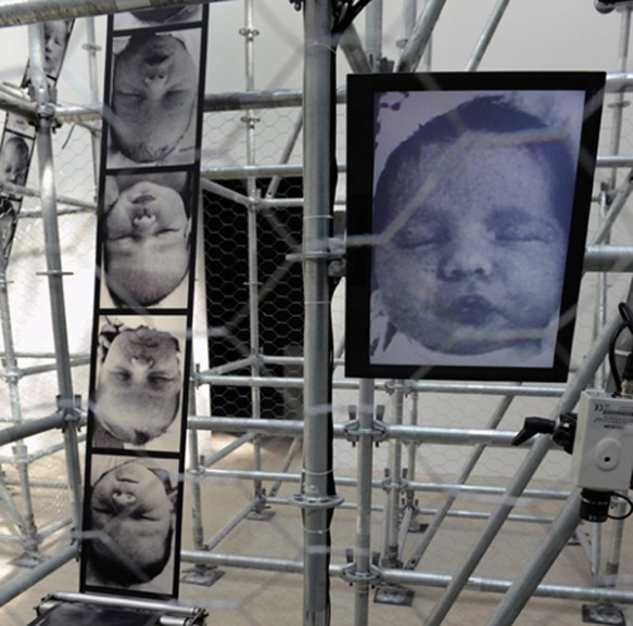 The main part of the space is occupied by a maze-like scaffold structure through which I loop of baby portraits runs like an overgrown film strip taking the long way round though a projector. The sight is an extraordinary one but there are obvious connotations of a baby factory. The noise of the mechanism is loud, dominating the space. Periodically though a bell rings and the thing grinds to a halt, putting a single baby’s face up on a screen. By chance, this is the chosen one. Singled out for what, there’s no way of knowing. It’s at this point that the closed eyes of the newborn babies become most apparent; they look peaceful but the sudden stillness could also suggest death.