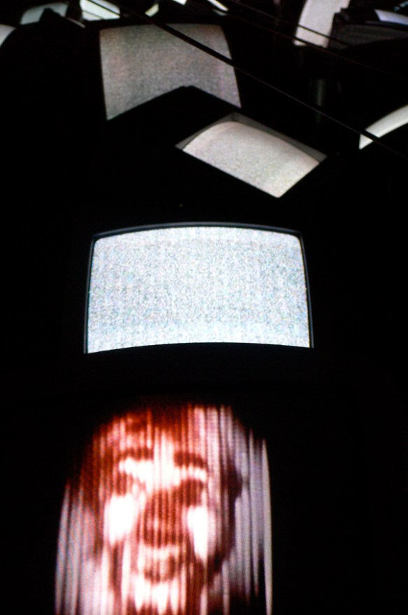 I’m exaggerating very slightly when I say there are 1001 different versions of snow. There are of course a few boxes that haven’t survived the show – the tellies have been gathered from recycling programmes and are ones people are getting rid of rather than attaching set-top boxes to get a digital signal – but apart from that a couple of sets (I noticed two, there may be more) are, I assume, attached to DVD players so walking round the space reveals the odd screen showing a shadowy, indistinct figure. The ghost of television past, perhaps?
