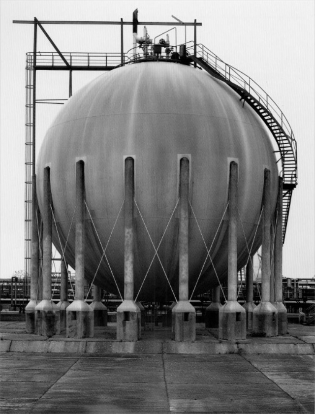 It would, I suppose, be possible to see Bernd and Hilla Becher’s pictures of industrial structures as boring, particularly if one were to restrict one’s attention to one or two pictures, though for me I think fascination with the detail always wins out. These are perfect pictures. They record the appearance of industrial structures – water towers, gas holders, mine heads etc – with complete objectivity and in forensic detail. The pictures were made over a period nearly five decades – they started collaborating in 1959 and continued until Bernd Becher’s death in 2007 – using a large format camera in the neutral lighting of overcast weather. The structures are viewed straight on, so that verticals remain vertical; the large format camera helps here but the Bechers also worked from raised viewpoints so that we are looking at the structures as directly as possible.