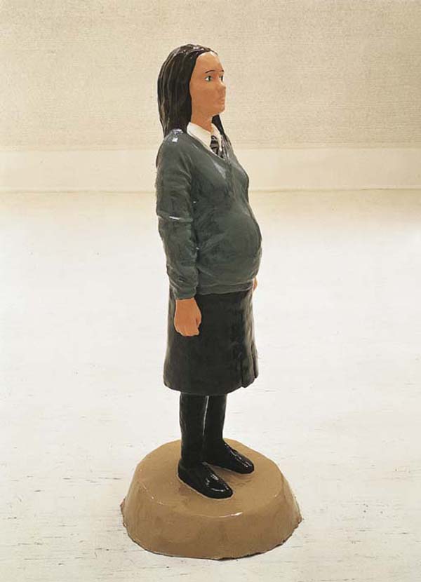 Stewart’s pregnant schoolgirl carries all the hallmarks of the charity box children, apart from the leg brace or crutches that were usually the preferred signs of disability. She stands straight and shiny on the same lumpy base as if waiting for our donation. Given her lack of a collection box, had she been one of the Spastics Society’s boxes, we’d probably have put the coin in the top of her head; but of course this begs the question about whether we would have been willing to give. The upright posture and the base that prevents others from getting close gives the feeling that the girl is now cut off from her peers; the school uniform marks her out as a child in an adult world she can’t yet fully understand. Though she still wears the uniform, she is no longer hanging out with friends in the playground.