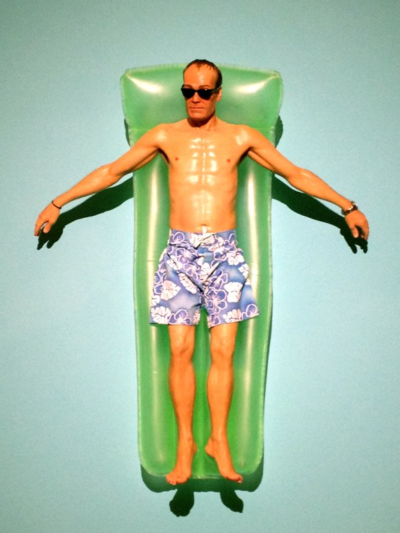 Drift occupies on wall of an otherwise empty gallery. A man floats on a lilo on a sea of turquoise. Well, I say he floats. It’s hard to see it any other way but the sea of turquoise is the wall so the floating is imagined given that the man and his lilo are vertical. He seems bathed in sunlight; his hands hang over the sides of the airbed, as though trailing water. He looks relaxed though his eyes are invisible behind his sun glasses and his face is slightly stern.