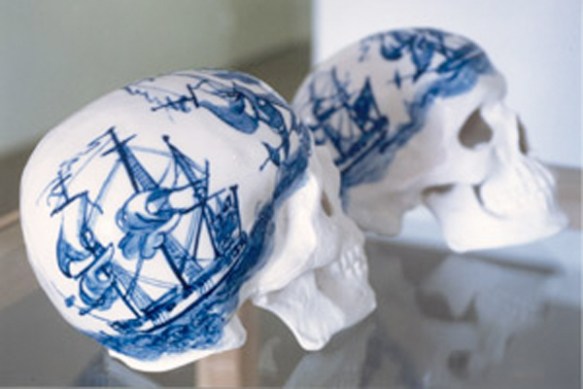 The skull is a powerful symbol. While others have used real skulls as the basis for drawing, sculpture or installation, Christine Borland has used skulls as a starting point for making works in other materials. The skulls in Christine Borland’s Family Conversation Piece are made from fine bone china which is then traditionally decorated in blue and white. The work was originally made for an exhibition at Tate Liverpool, so the choice of bone china was a deliberate one intended to resonate with Liverpool’s history as a producer of china with the decoration – in the style of the porcelain made in Liverpool in the eighteenth century – also referencing the city’s history as a trading port involved in the shipping of both produce and slaves.