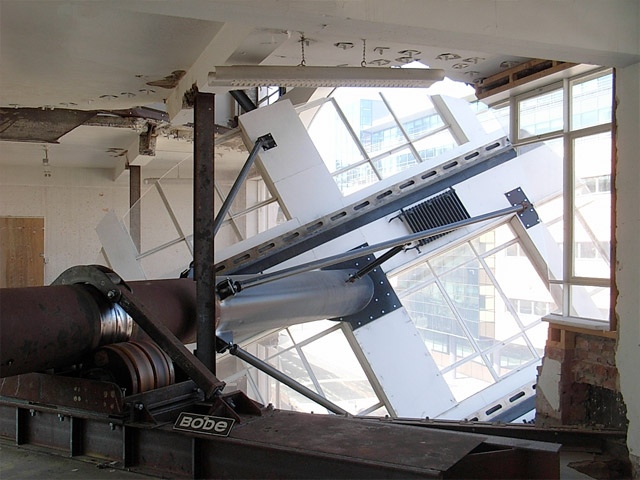 The installation was made by cutting into the building in a way that seems to reference Gordon Matta-Clark’s Conical Intersect (Building Cuts), but instead of forming a new viewpoint by discarding the cut away section, Wilson attached the circular cutout to a new motorised structure so that part of the external wall of the building rotated and turned itself around.
