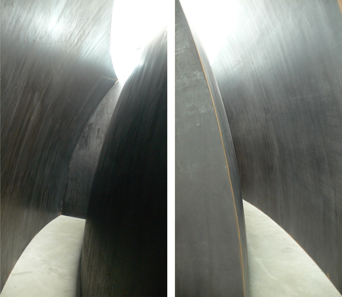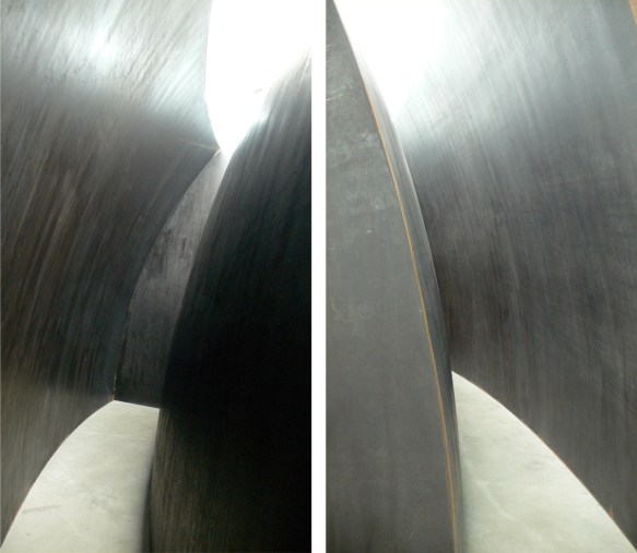 Richard Serra’s sculptures scare me. Well, sort of. When I stop to think about the weight of steel and the way they just stand there minding their own business but capable of crushing anything in their path should they choose to fall, then they scare me. Mostly I just kind of marvel at the scale of them and at the quiet way they hold their immense power in check.