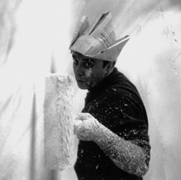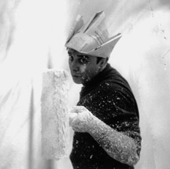 Given how much has been written recently about Damien Hirst not making his spot paintings himself, it amused me to find this picture of Klein painting the room in Krefeld himself, complete with silly hat. This is clearly a work that is in no way dependent on the artist’s hand but then, regardless of whether or not technicians were on hand to do the painting for him, I suspect Klein was always mindful of the enduring power of a good photo-opportunity.
