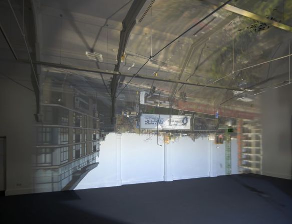 This isn’t a conventional camera obscura. The image isn’t contained on a screen; rather, it’s allowed to spill through the space, across ceiling walls and floor, merging with the architectural features of the gallery adding to the confusing of the inversion of the familiar chaos of the Finchley Road.