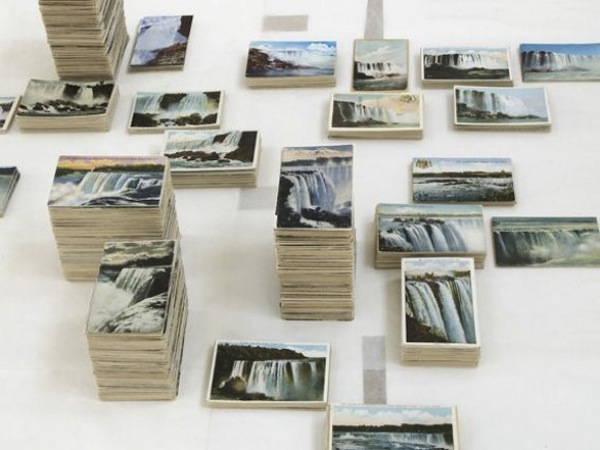 In the final space, piles of old postcards are stacked up on a trestle table. The piles are uneven in height and seem spaced somewhat randomly. Reaching the table it’s apparent that the postcards are all of Niagara Falls, showing the falls from different vantage points. The arrangement of the cards is intriguing but and I study the views and the text quite closely, getting a sense that there is something particular about the way they are set out.