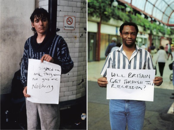 Signs that say what you want them to say and not signs that say what someone else wants you to say (I signed on and they would not give me nothing) and (Will Britain get through this recession), 1992-3