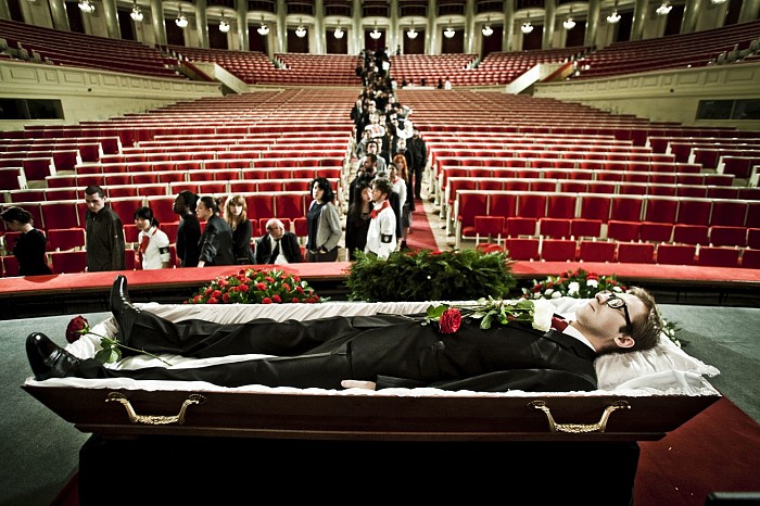 Taking Sierakowski’s – fictional, he’s still very much alive – assassination as its starting point, the final film centre’s on a memorial for the revered leader of the JRMiP at which different speakers offer different perspectives. Again there is a blurring of the boundaries between fact and fiction with a number of contributions coming from people playing themselves – including a holocaust survivor – alongside actors playing fictional characters. There are aspects of the staging of the memorial that, like the stadium event of Nightmares, carry resonances of fascist rallies.