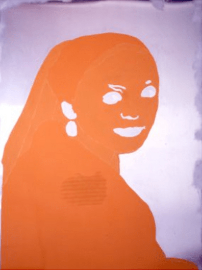 Gary Hume’s take on the painting is at first sight a very simplified reworking; the girls becomes an orange silhouette with her features and that earring rendered in white. Look closely though and there are signs of more detail hidden under the surface. This is an approach Hume uses often: the subject of the painting is drawn out in outline form before being painted over – generally in household gloss or enamel paint – so that the lines of the bottom layer form a slightly raised and just visible drawing.