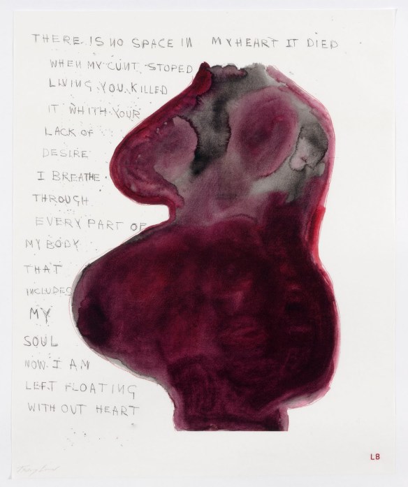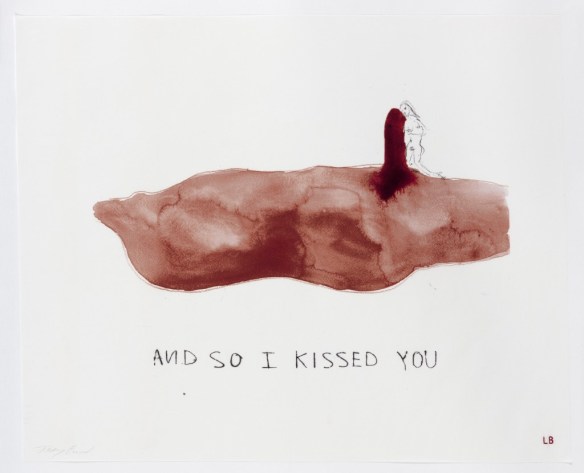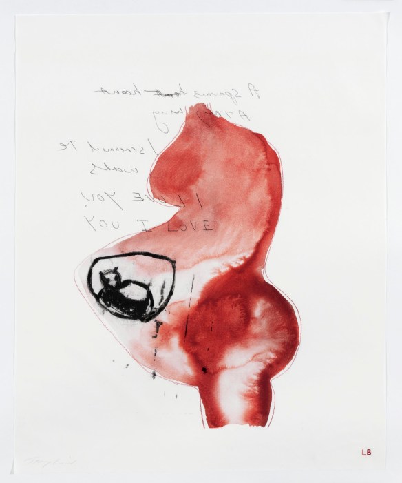 In London, the works were shown at Hauser and Wirth at their Old Bond Street space – no longer used now that they have the Savile Row spaces, I think – in 2011. The gallery, which is rather grand, with red walls and a parquet floor, is unfamiliar territory for a contemporary art audience more comfortable in white cube spaces or indeed empty shops or former industrial buildings, but it’s one Hauser and Wirth always used well and Do Not Abandon Me both fitted and challenged it. The prints are modest in scale and the bloody, bodily nature of the colours Bourgeois used meant that there was no immediate visual incongruity but as the nature of the images became apparent there was a conflict between the polite surroundings and the nudity, Emin’s words and the somewhat prominent phalluses.