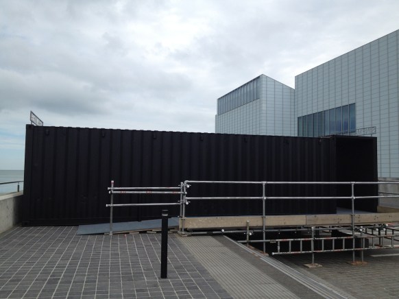 The entrance to the space is at either side of the back wall meaning it’s clear how long the container is before you get inside it which means it’s immediately apparent that the cinema screen is at the half way point (or thereabouts). The image on screen is of the sea. The very same sea that’s just outside except something is subtly different – your mileage, or more accurately, your weather may vary; the difference could be quite pronounced – the light isn’t quite the same somehow.