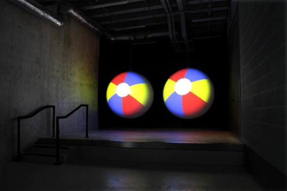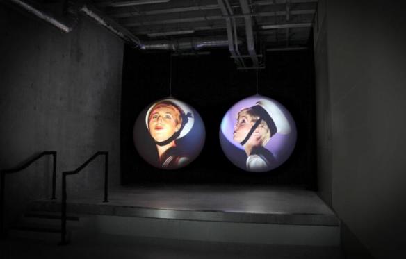 Arriving the space, the focus of attention is what turns out to be the projection screen. But rather than a single flat screen, this takes the form of a pair of large white orbs; these appear to be suspended inflatable spheres and as the work begins the image projected onto them makes them giant beachballs – we’re at the seaside after all – but even in their beachball-ness, there’s a hint of eye about them but eyes with white pupils. Those two ideas, hinted at as the opening image, form the basis of the work to an extent. In Entangled², Seers explores some of the stranger aspects of seaside culture but. characteristically, the starting point for the work is from Seers’s family history. Her great, great uncle had a condition called heterochromia which meant that his eyes were different colours something that can result from twins becoming one in the womb; the resulting person carrying elements of their subsumed twin’s DNA. This idea lies behind the paired imagery throughout, with a subtle colour shift between the two screens.