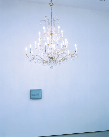 I first saw chandelier works by Cerith Wyn Evans at White Cube in 2003. Here the lights were simpler insomuch as they were all plain crystal rather than coloured glass (let’s face it, by their nature chandeliers are never really simple and some of these were pretty intricate). Here each light was emitting a different text – including essays by Theodor Adorno and John Cage – silently speaking over one another, each determinedly sticking to its own reading, inviting us to engage with the text but providing a wilfully inadequate opportunity for us to do so.