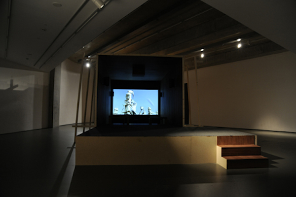 When I saw Summer Camp recently – it’s included in the exhibition The Edge in Landscape at the Towner – it was shown in a temporary structure within the gallery space. This strategy serves as a reminder of the likely temporary nature of the construction project we see on screen.