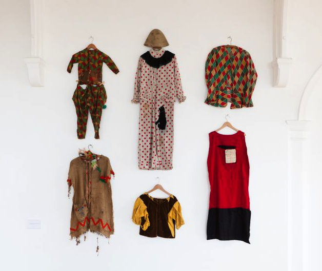 In the first space, there are artefacts from Lacey’s childhood – including the costumes worn by Lacey and his sister for dressing up games and presenting shows to their family, evidence that his showmanship and sense of the absurd (one of the costumes is a postbox, for instance) started early – some presented as installations, along with his paintings from Hornsey School of Art and the Royal College of Art.