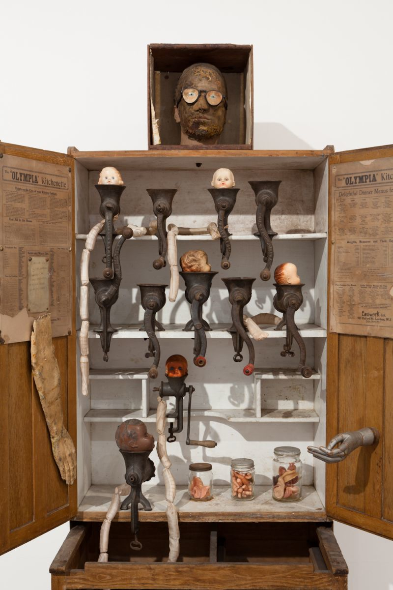 Many of the works here, made in the 1960s and ’70s, are assemblages – sculptures made from putting parts of objects together as a kind of three-dimensional collage – often quite literal once one understands Lacey’s thinking, but with a dose of absurdity. For instance School Days, which shows the head master overseeing the process of turning children into uniform beings, presented here as sausages emerging from mincing machines into which the children – in the form of dolls’ heads – are being fed.