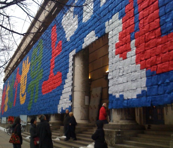 It’s possible for text to become meaningless shapes when we’re too close to it, especially if it’s written in an unfamiliar script. At first glance, maybe even to those who read Mandarin, the colourful wall of the Haus der Kunst Museum in Munich which faced visitors to Ai Weiwei’s 2009 exhibition So Sorry, might have seemed more like a cheerful pattern rather than the poignant words of a grieving mother. The colour palette of red, yellow, green and blue is more redolent of children’s books than works of art and certainly doesn’t immediately suggest a memorial. Look closer and it’s clear that the building blocks of the banner are brightly coloured backpacks, the sort that children often use as school bags. But this is a work that needs an explanation.
