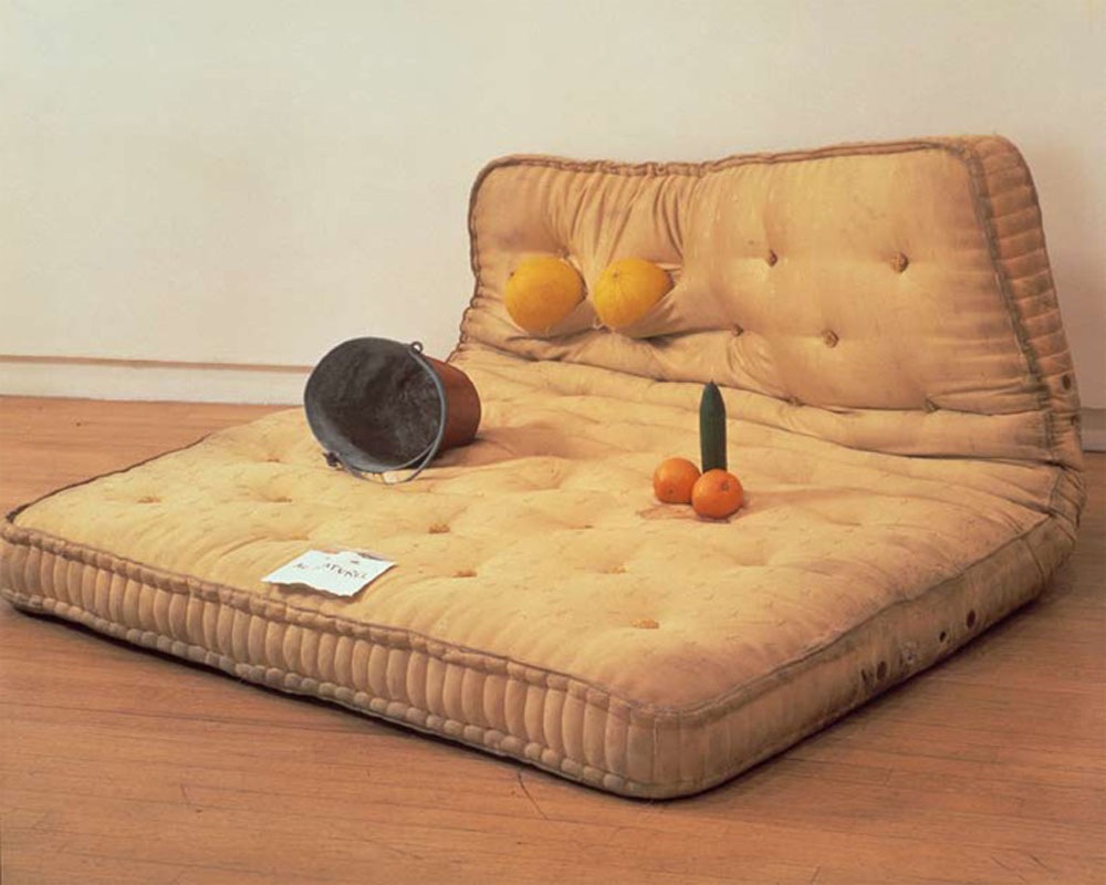 Essentially, Au Naturel is a very simple sculpture of a man and woman in bed, he represented by two oranges and a cucumber, she by a bucket and a pair of melons. What makes this work for me is that the visual joke of the assemblage triggers thoughts about language and the slang terms used for body parts. In particular, with works like this, Lucas draws attention to the derogatory way women’s bodies are often described colloquially.