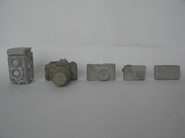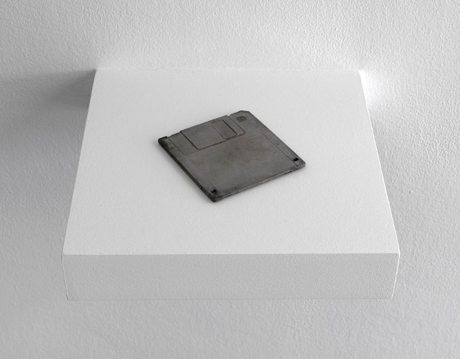 Like Stone, a concrete cast of a diskette in the lobby upstairs, Fossilised is technology held in the moment: preserved for posterity but now useless. Seen in the context of Preserved, the cameras reiterate the notion of the photographic present in that work in the form of the flash.