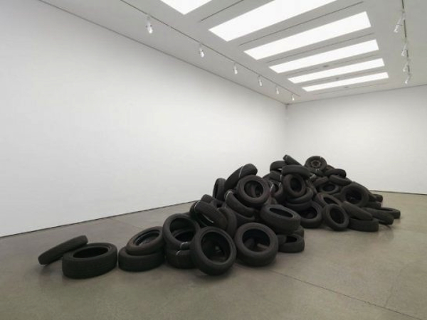 In the upstairs gallery, a long unruly pile of tires runs almost the length of the gallery. Running over it is a straight line of white, perfectly drawn in salt. The line goes up and down as it crosses the ridge of tyres but if you look down on it, it remains straight. The press release talks about salt as both a preservative and a commodity but also suggests a possible alternative reading as a line of cocaine. Given the title of the piece – Congo River – and the way the white line traverses the tyres, the idea of a journey seems clear. The press release talks about the river journeys in Heart of Darkness and Apocalypse Now, both of which, it says ‘use a journey along a river as a mythical and symbolic setting to examine notions of colonial repatriation, fear of the unknown and the ‘other’.’ None of which, if I’m honest, I would have got from the work. Nonetheless, for me the perfect line drawn in a wilful material on difficult terrain seems a powerful enough symbol without the references to literature and film. The tyres also suggest a broken landscape to me, in part because of the form they take, which is a kind of mountain range, but it’s also to do with the strength of the smell of rubber. And of course, abandoned tyres are generally found in more run down areas, which perhaps does bring me round to the idea of trade routes and exploitation.