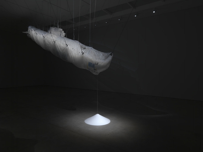 As is often the case at White Cube Mason’s Yard, the most enagaging work is saved for the main gallery downstairs. It’s here we find Hollow/stuffed, market law, a submarine – apparently based on a plastic toy of a World War II submarine – made from plastic sacking used to transport sugar, and other foodstuffs. The room is dark but for the lights trained on the sculpture, so it seems to glow slightly and casts shadows around the space. The submarine looms but its menace is reduced by the realisation that it’s not a solid object; indeed at the front a steady stream of salt pours out into a pile on the floor. The pile – rather larger now than it was when the photograph above was taken – is an ever growing conical mound with suggestions of time passing and of course of the imperfection of the structure from which it is pouring. Again the press release offers a reading I wouldn’t necessarily have reached without it but which offers an interesting perspective; submarines are now used as a means of trafficking cocaine from South America into Mexico, Ortega’s country of origin.