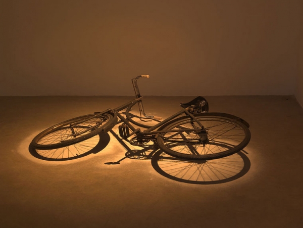 In the smaller lobby space downstairs lies a bicycle with salt underneath it. It looks as though the salt has been poured over the bicycle, so that there’s a perfect negative space drawing of it in the salt on the floor. A light flashes from above from time to time aligning the shadow with the drawing. Here the salt is literally preserving the image of the bicycle, though of course it could also aid the process of decay. From across the room this piece is watched by a series of cameras – from a Rolleiflex twin lens reflex medium format camera to an iPhone – cast in concrete.