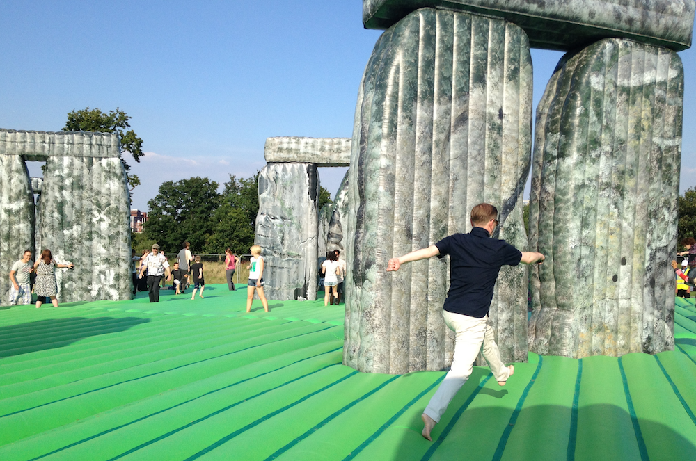 There’s something different about London this summer. The Olympic feelgood factor coupled with a bit of actual sunshine after the seemingly interminable rain means we seem to have found ourselves in a mood to both celebrate our country and the odder aspects of its history and traditions and to jump about. On hand to help out – as part of the London 2012 Festival, the culmination of the Cultural Olympiad – is Jeremy Deller’s Sacrilege. As playful reworkings of our heritage go, a life-size bouncy castle version of Stonehenge certainly hits the spot (especially as it comes complete with anxious announcements about health and safety).