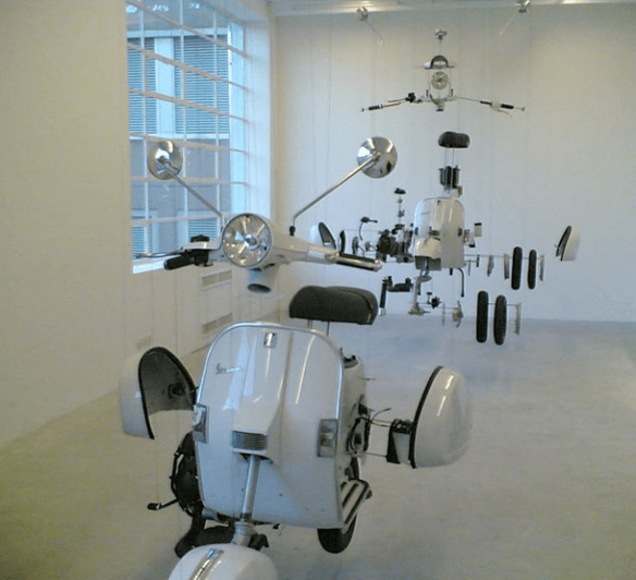 The VW Beetle is not the only vehicle Damián Ortega has used as art materials. In Miracolo Italiano Ortega presented three Vespa scooters in various states of wholeness. The scooter leading the parade is whole but the ones behind it are exploding out into the space, with the second one showing early signs of breaking up and the third one as fragmented as the Beetle in Cosmic Stuff. Like the Beetle, the Vespa is a twentieth century icon and Miracolo Italiano was made for an exhibition in it’s home city of Turin