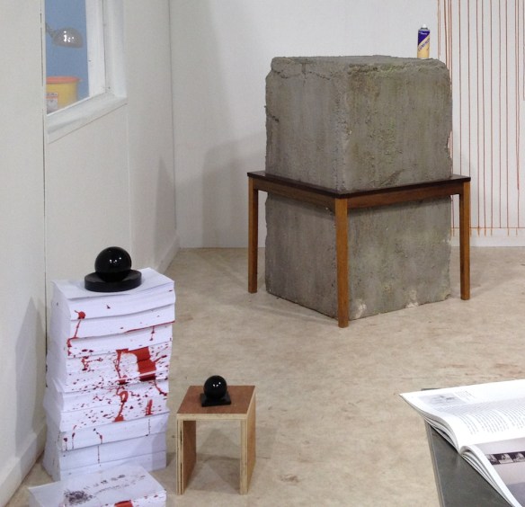 The basis of the work is an art fair stand complete with sculptures on plinths and shelves but with what look like blood-spattered walls and bloody footprints. Crime scene tape closes off small parts of the space but there is a lot to look at. This is familiar territory of course, but it’s familiar from film and television rather than the gallery; even the most avid armchair investigator, ever on the lookout for clues when watching police dramas, would be hard-pushed to make complete sense of a narrative frozen in time.