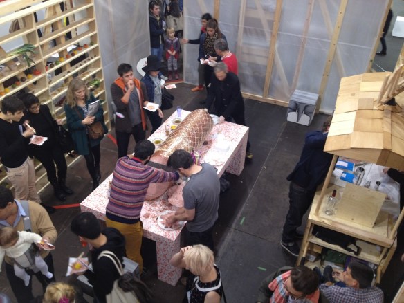 The project that probably excited me most though was the Grizedale Arts/Yiangjiang Group stall Colosseum of the Consumed which brought the sort of eating and shopping opportunities that would not normally feature at an event like Frieze Art Fair. Some aspects of this weren’t pleasant – this vegetarian found the smell of the enormo-sausage being consumed on Saturday afternoon hard to bear, but is thankfully she stayed away from the vermin dinner earlier in the day – but the somewhat ad-hoc village fête feel to the installation was a pleasing contrast to the perfect white wall spaces of the gallery stands.