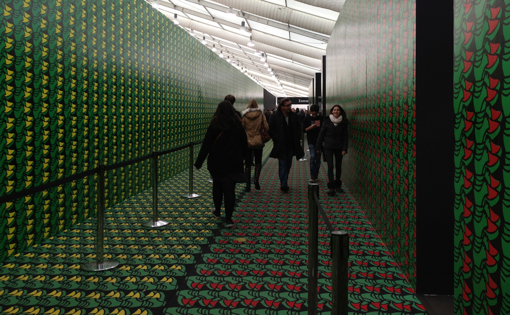 Certainly the next project announced itself rather more loudly. Thomas Bayrle’s Sloping Loafers/Smooth is art as hard-to-miss interior decoration, with a brightly coloured image of shoes turned into a repeat pattern covering for the floor and walls of the passageway leading in to the fair. Inside several of the seating areas are decorated with the Laughing Cow cheese logo reworked in blue and white. In a way, the garishness of Bayrle’s piece acts as an advance warning system, reminding visitors from the outset of the visual excesses ahead. While it’s not something that will stay with me as a piece of art, it did make me smile and in a way the closed in feeling it gives the entrance corridor means that one emerges into the fair with a feeling of relief at the sudden spaciousness, though obvious the reality of this as a frenetic and crowded space hits home soon enough.