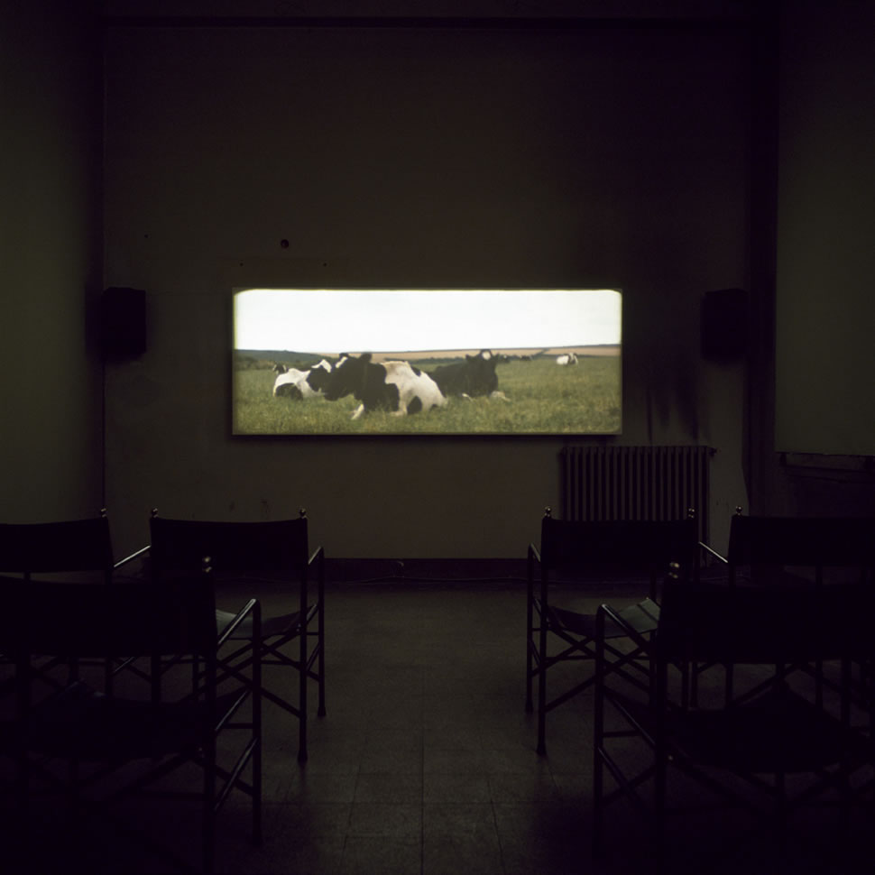 The cows stand around. The eat a bit of grass. Gradually the light fades. Interrogates the sky but the cows, accepting the unexpected arrival of night, just have a little lie down. The sun reappears and the cows restart their interrupted day. They eat a bit more grass. Normality is restored and all is right with the world.