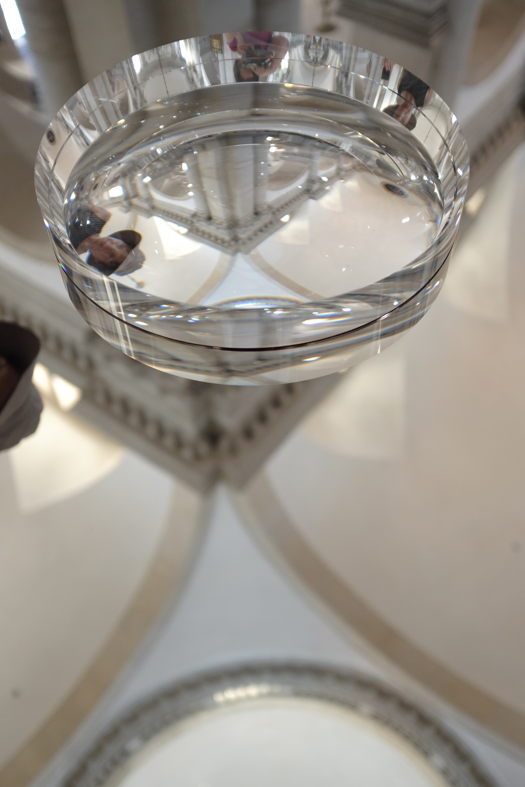 John Pawson’s Perspectives, first shown in St Paul’s Cathedral in London in 2011, is a Swarovski crystal lens, 40cm in diameter which reflects and magnifies the space it’s in. In Venice it was installed in the Basilica di San Giorgio Maggiore, an extraordinary building designed by Andrea Palladio in the sixteenth century (and finally completed in 1610, three decades after Palladio’s death). In 2011 the basilica hosted an ambitious but ultimately unsuccessful to the point of invisibility (thanks to technical problems) work by Anish Kapoor (which I touched on in an earlier article for MostlyFilm); it was the memory of that work (and the enjoyment that came from watching visitors concentrating really hard in an attempt to catch sight of the work during its fleeting appearances.