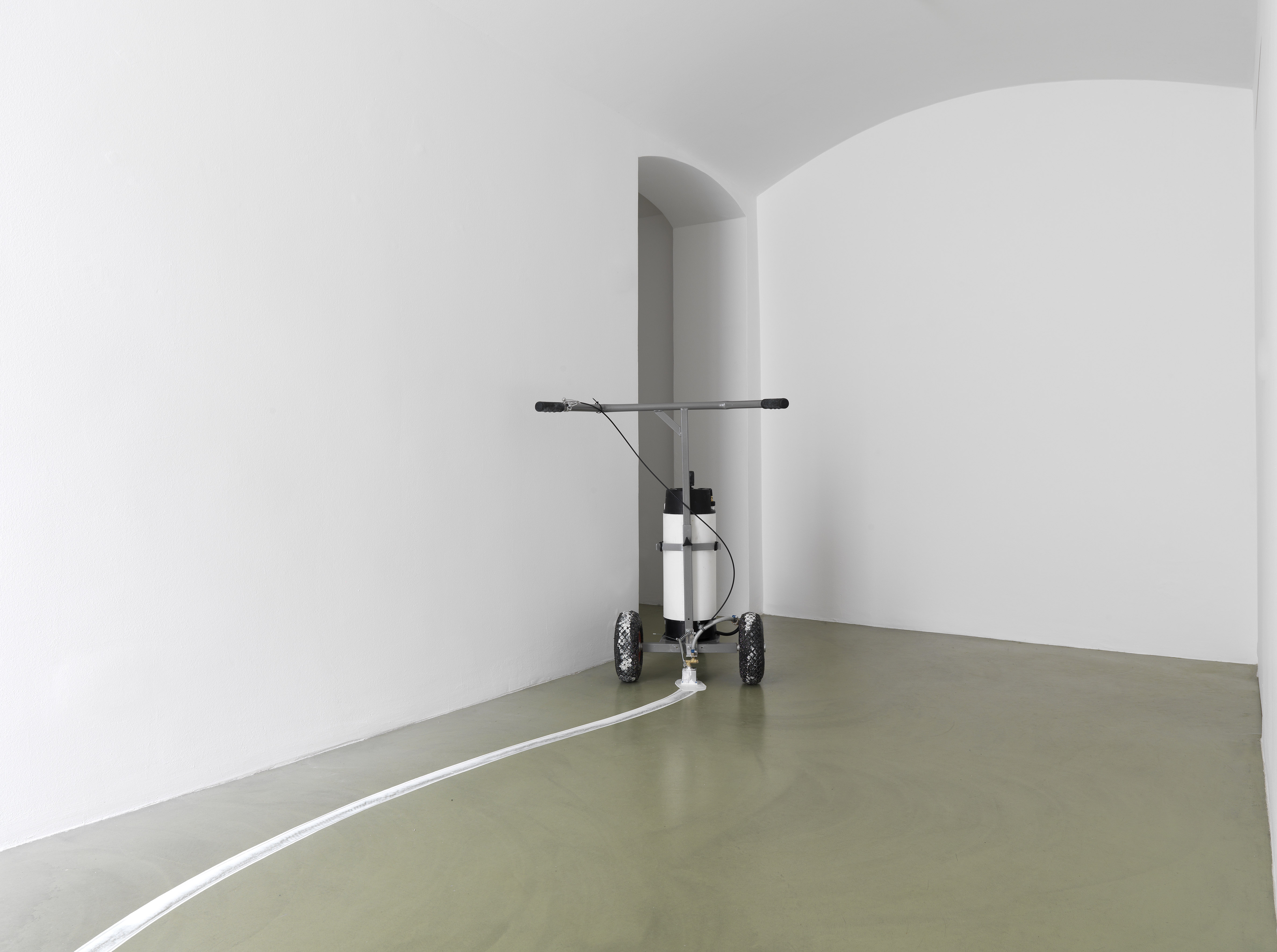 There are lots of drawings that fit neatly under Klee’s description of ‘taking a line for a walk’ but few that do it quite as literally as Ceal Floyer’s Taking a Line for a Walk, in which a line painting machine of the sort normally used to mark out tennis courts and the like is walked through the gallery space leaving a trace that takes the audience on a journey through the space.