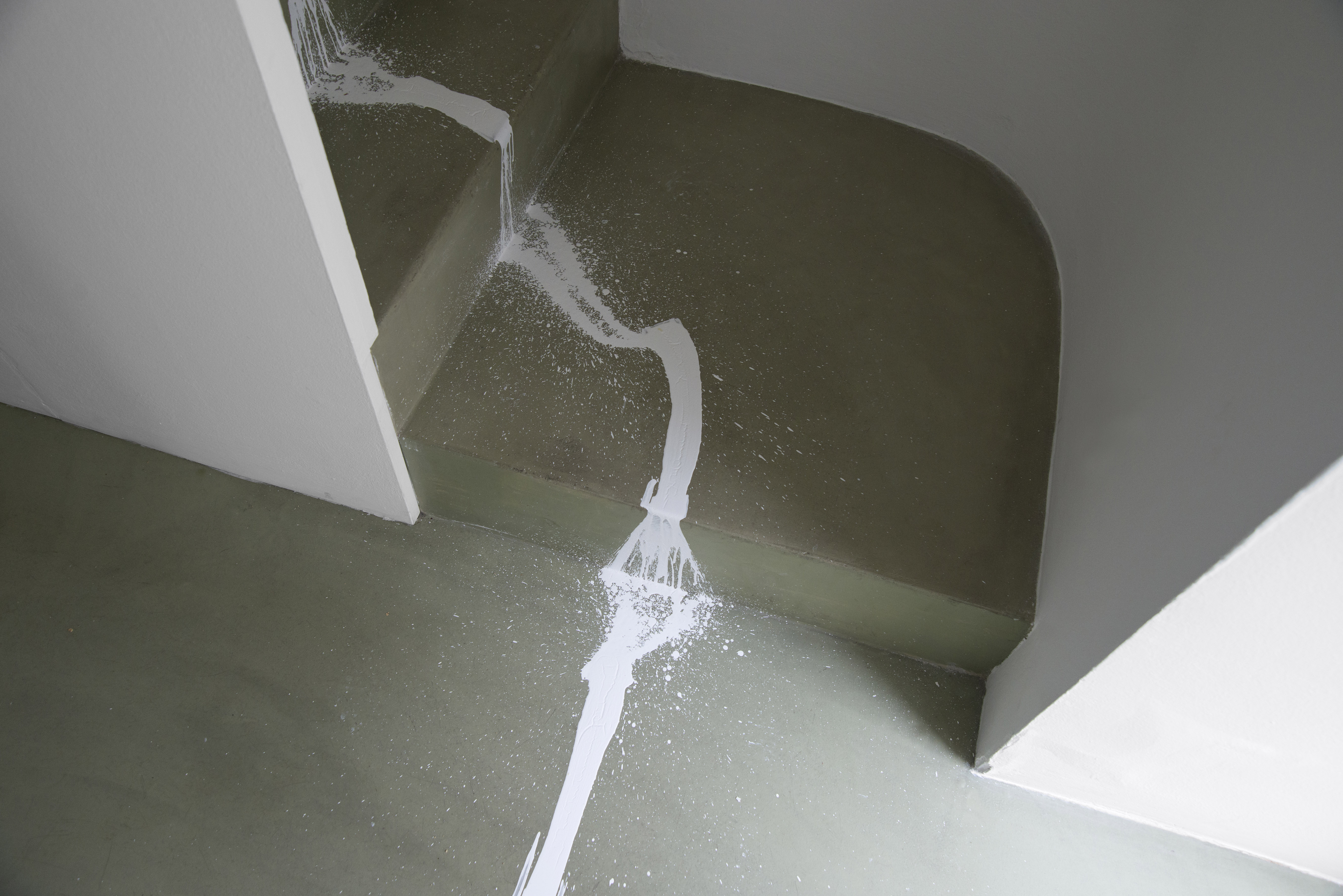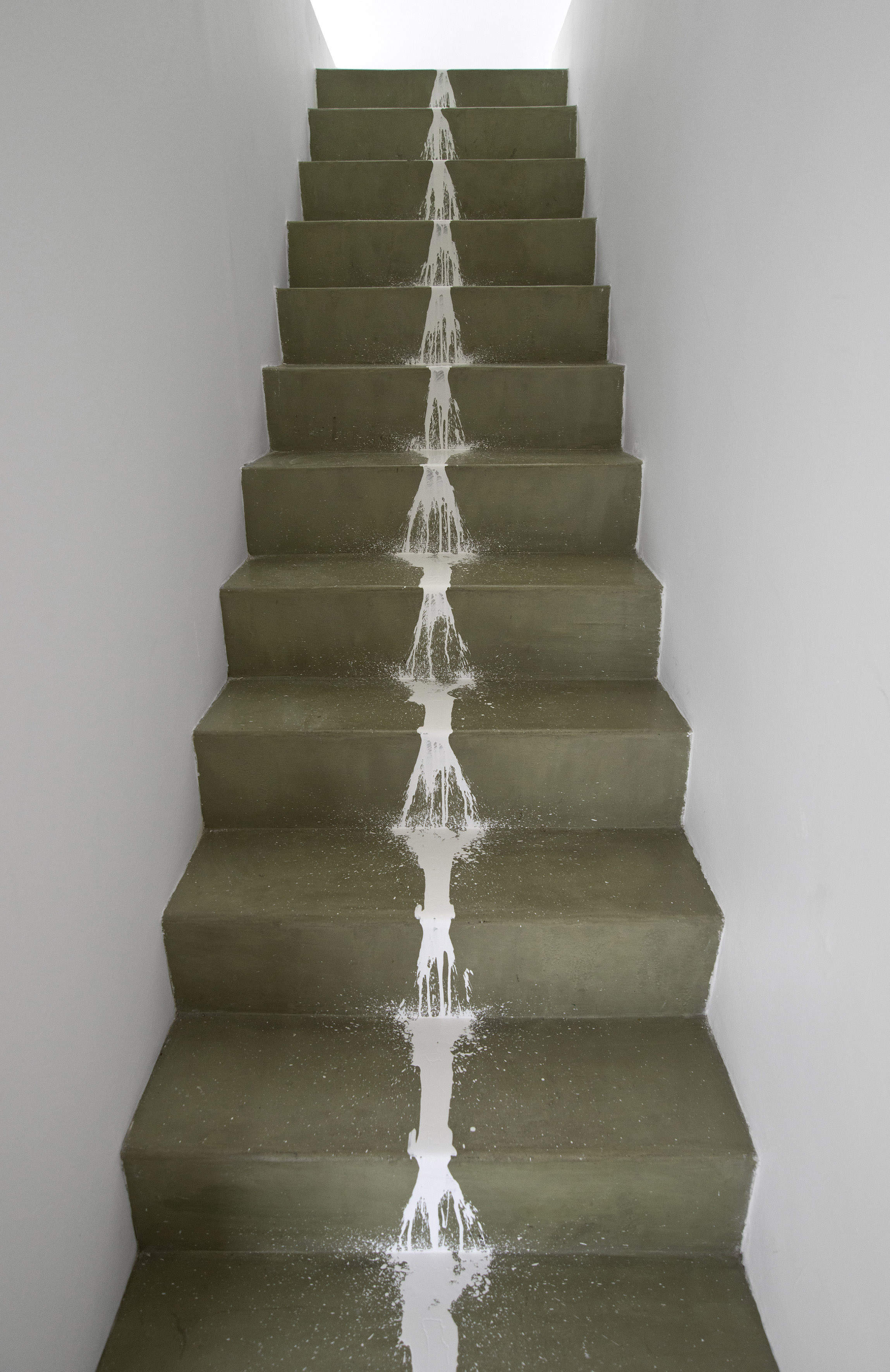 The line goes up and down stairs, it goes round corners, it goes everywhere we might otherwise go looking for art but it leads us. I’m fascinated by the struggle the machine experiences on the stairs; designed for use on the flat, the machine draws what looks in a way like a waterfall – or paint fall, perhaps – on the stairs. Clearly not, in fact, the right tool for the job.