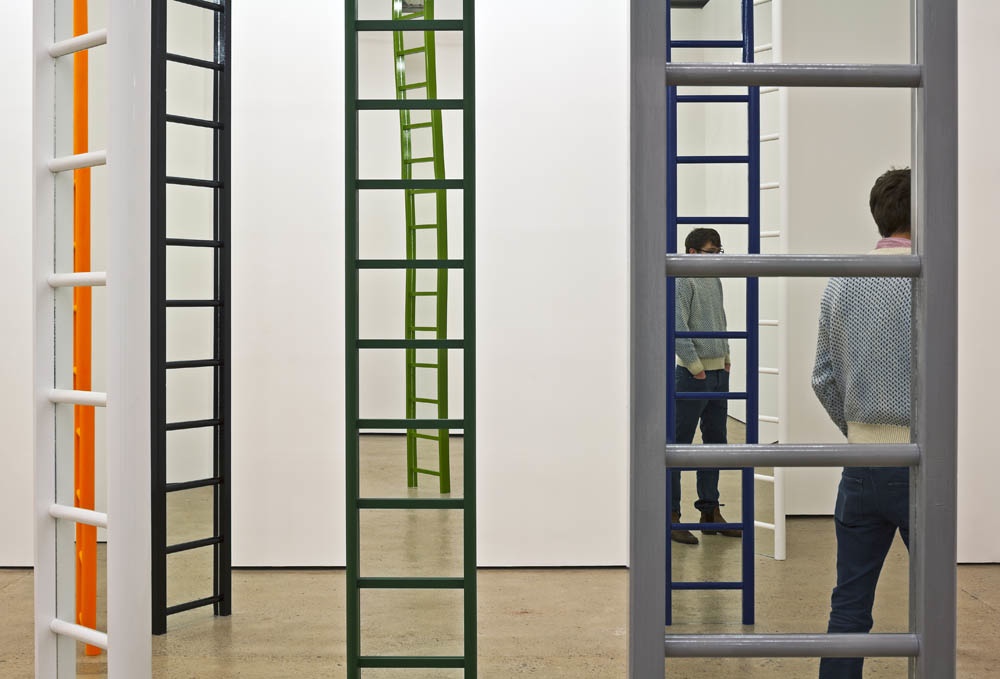 What fascinates me about this work is the combination of the excess of having so many ladders in such a small space and the ridiculousness of them standing apparently unsupported and the visual confusion created by the mirrors. It becomes hard to make sense of the spece, much less figure out what would happen if one were to take the leap of faith involved in attempting to climb a ladder here.
