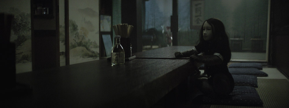 Even before we understand what we’re watching, it’s clear that Human Mask takes place in a strange, dystopian space. Our journey starts outside, travelling through a broken world of uprooted buildings, abandoned by those who once called them home. Moving inside, we find ourselves in the dingy interior of what was once a restaurant where a child-sized waitress in a blue dress still busies herself. The camera presents us with a close-up of an impassive human face but, quite apart from the waitress’s presence in an otherwise abandoned space, something is amiss. We gradually come to understand that the creature behind the flawless mask isn’t a child but a macaque monkey.
