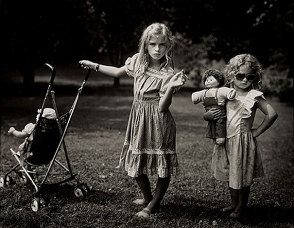 Sally Mann’s series of photographs of her children Emmett, Jessie and Virginia, made over a seven year period and both exhibited and published as Immediate Family, tells of the freedom of long hot summers spent in the countryside around the family’s home in Lexington, Virginia. Mann photographed the children only in the summer when they were out of school and free to play. Made with a large format camera, the pictures are very far removed from the informal snapshots we generally take to document family life. These pictures – whether they look it or not – are deliberately posed and carefully made. The children are playing but their play is for the camera.